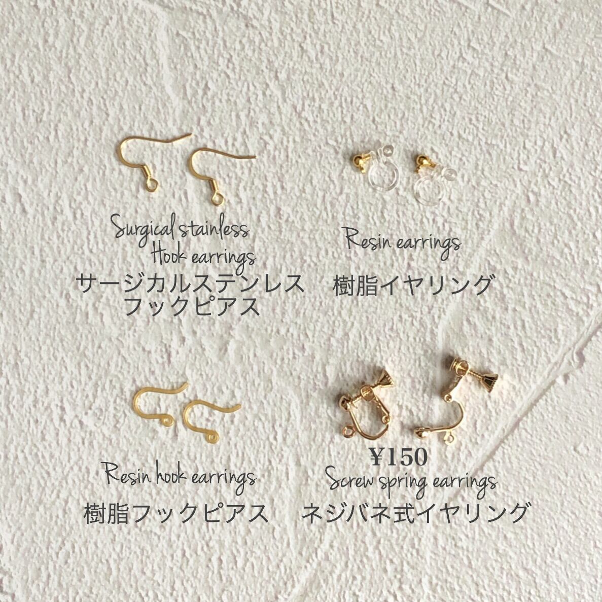 ★無料パーツはご希望のパーツを購入時に備考欄にご記入下さい。記入無い場合サージカルステンレスフックピアスでお作り致します。