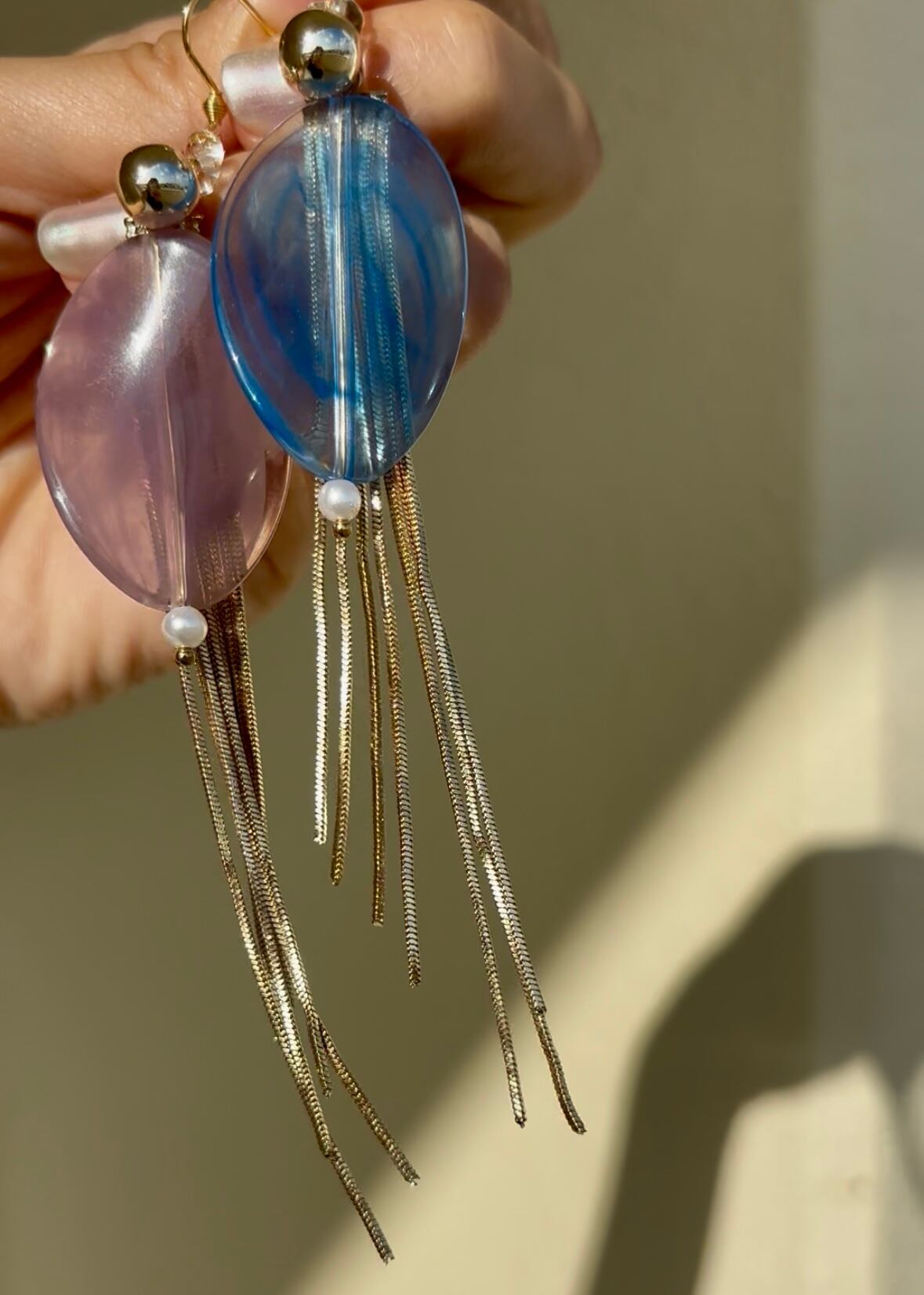 透け感のある涼しげなブルーとパープルの組み合わせが目を引き、華やかに揺れる大ぶりなデザインは、特別な日のおしゃれにぴったり。