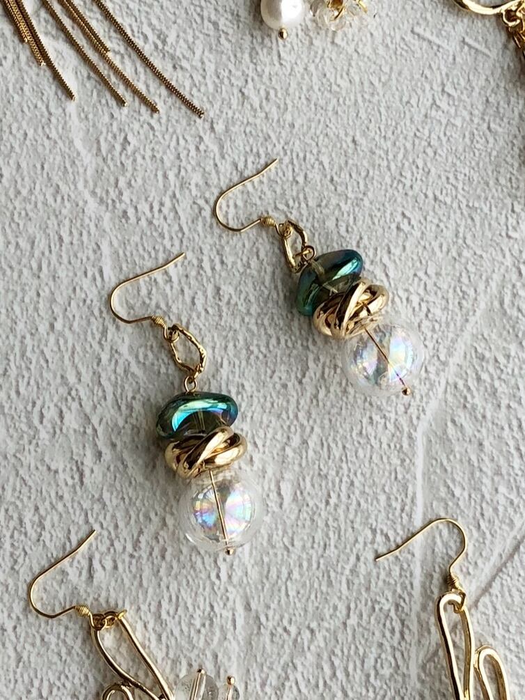 シャボン玉みたいなオーロラに輝くガラスドームと涼しげなブルーグリーンのビーズの組み合わせ♪