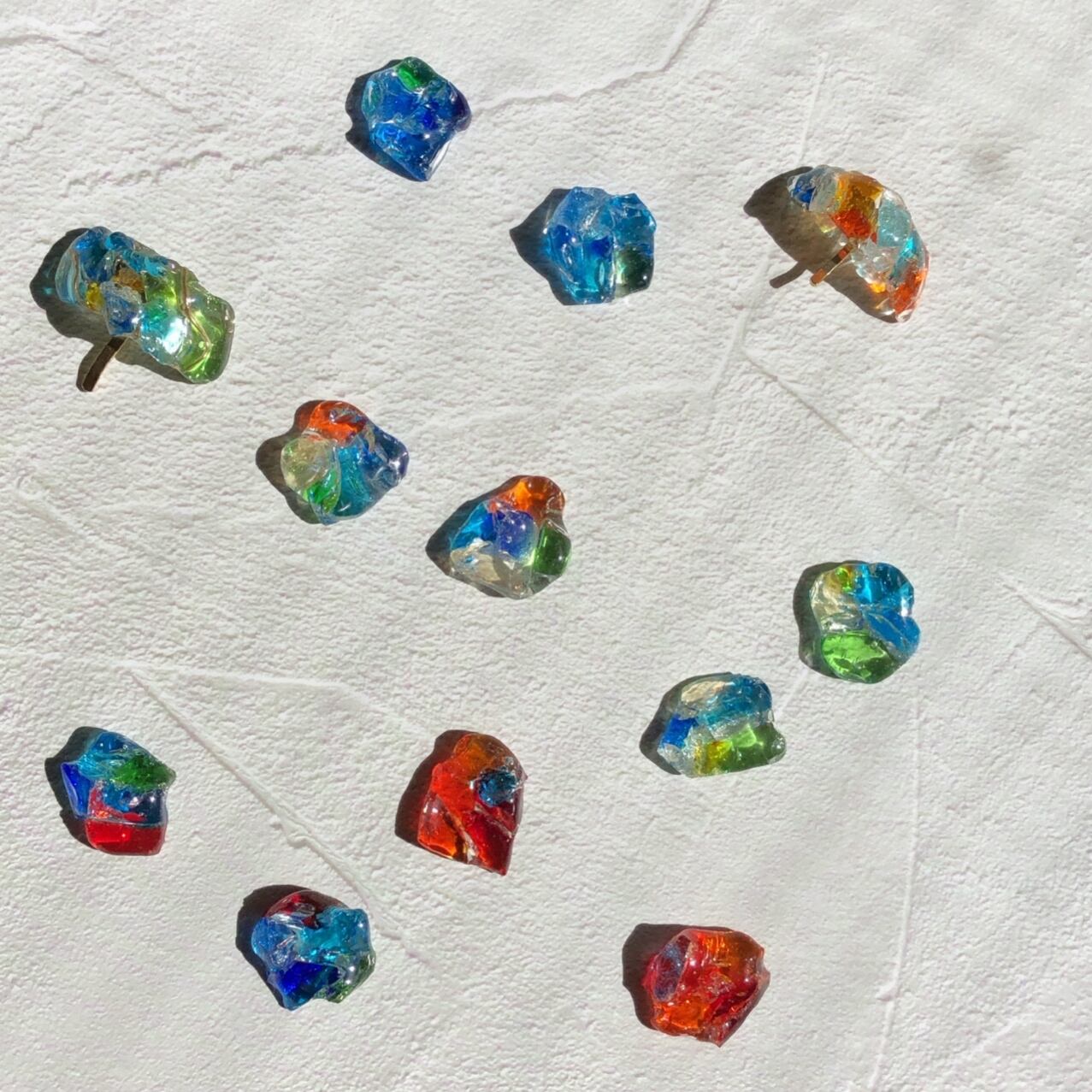 沖縄の琉球ガラスの欠片を使った、リゾート感たっぷりのカラフルなピアスです。