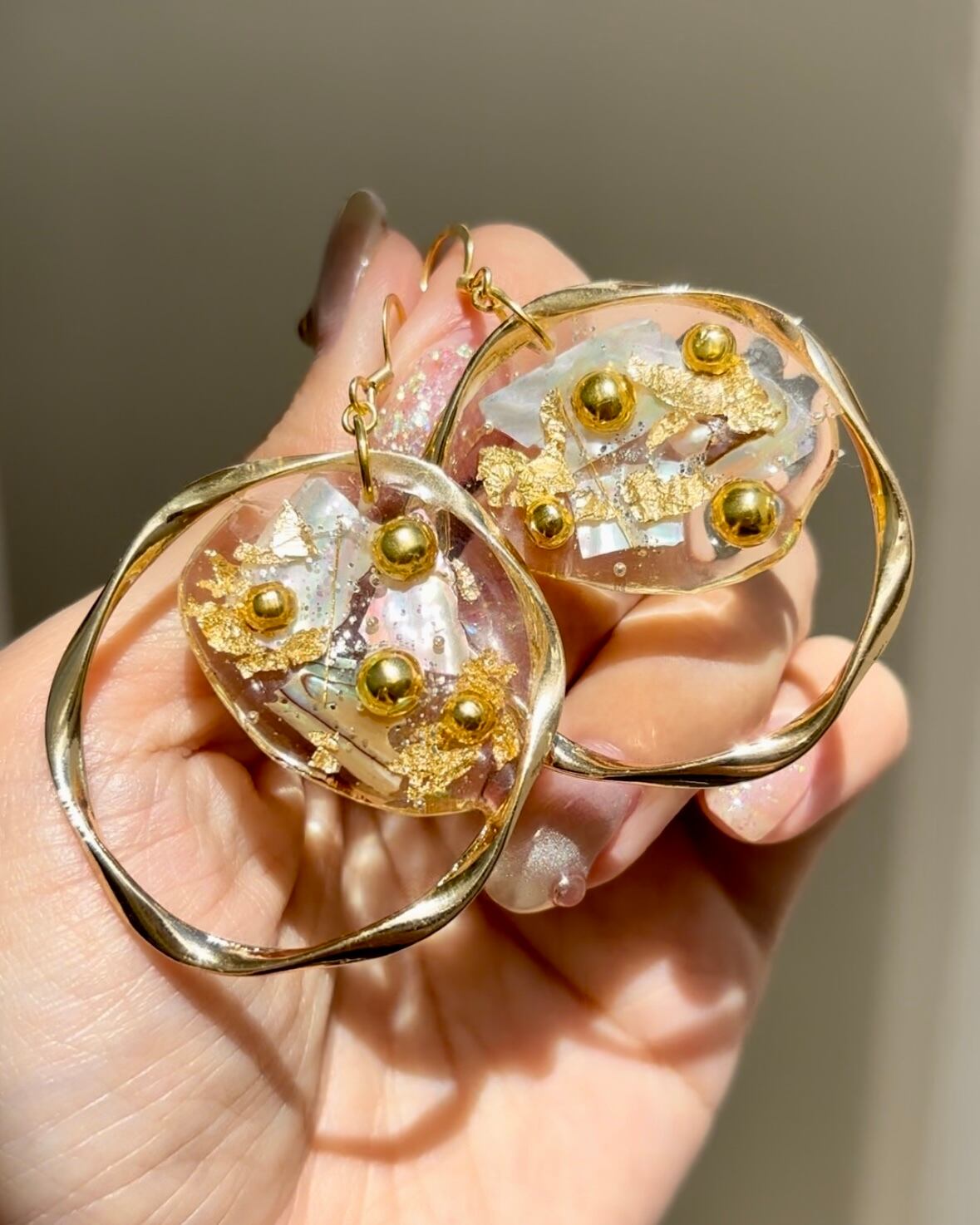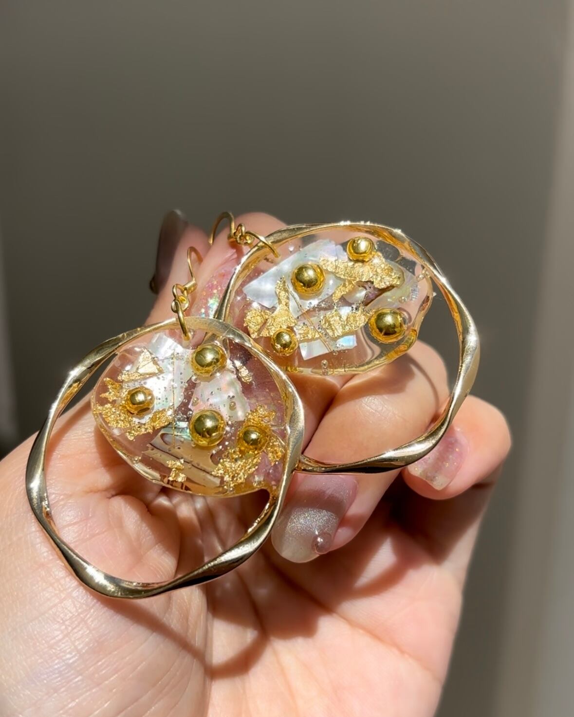 まるでクッキーのような可愛らしいデザインのグラノーラピアス/イヤリング/イヤーカフ。透明感のあるシェルと輝くゴールドパーツが絶妙に組み合わさり、華やかさを演出します。揺れるたびに印象を変え、様々なシーンで楽しむことができるアイテムです。日常使いから特別なイベントまで、どんなコーディネートにもぴったりです。