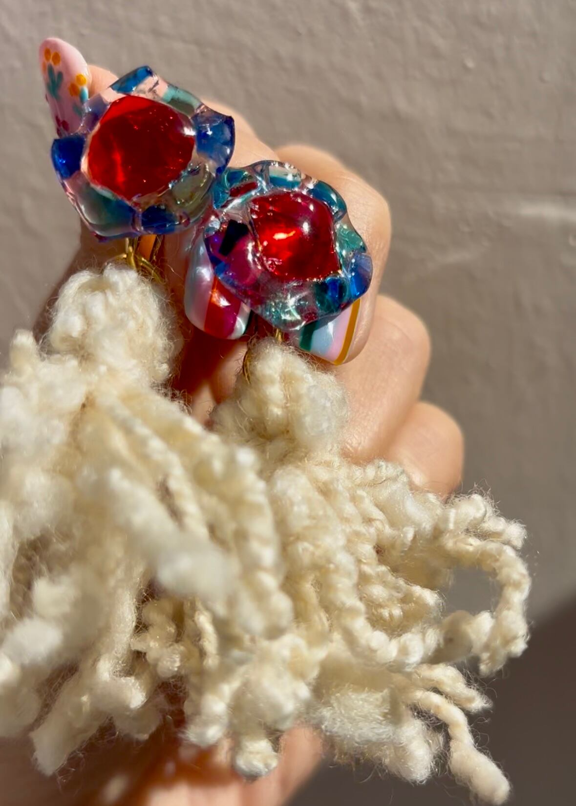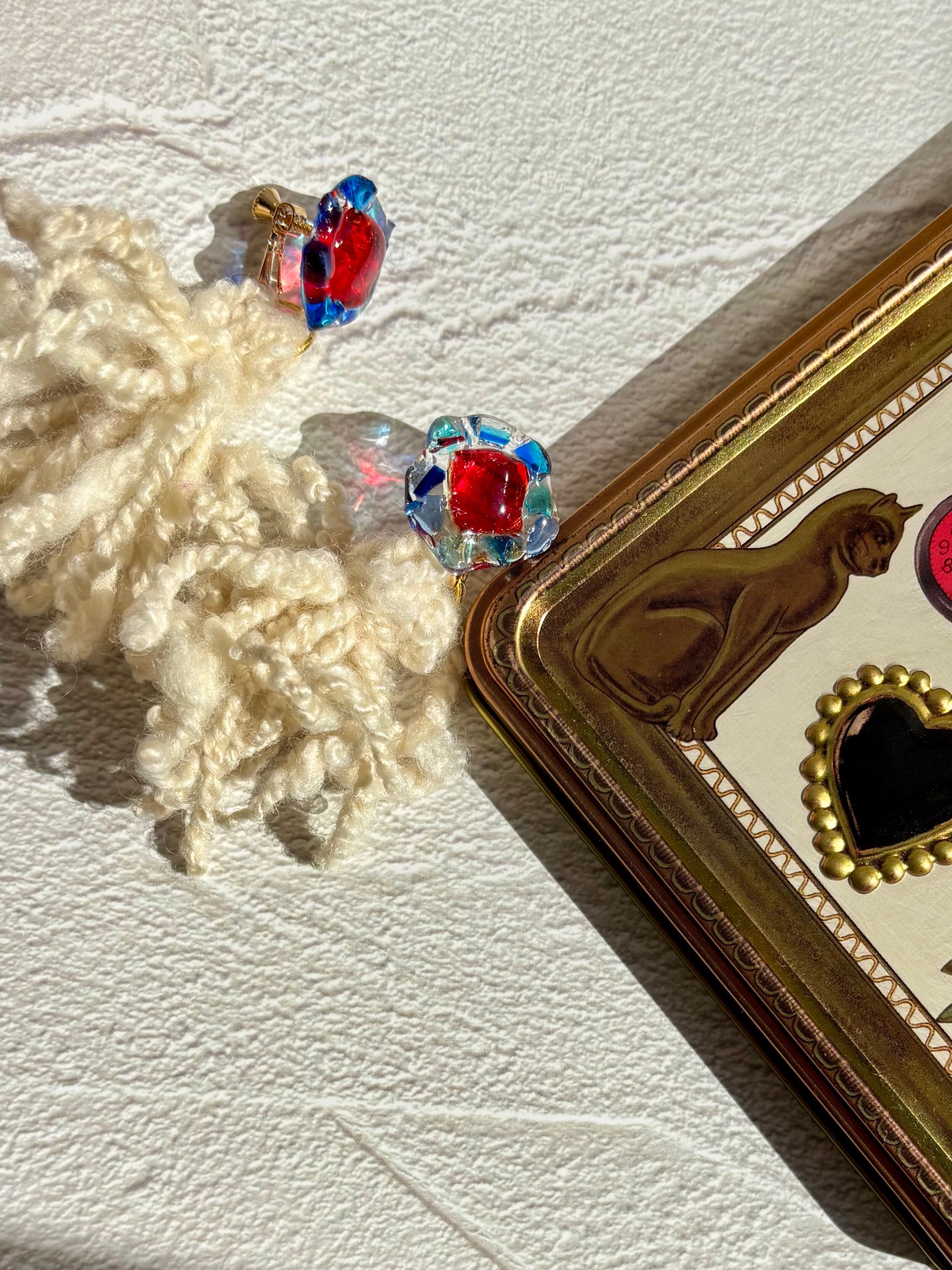鮮やかな琉球ガラスともふもふの羊毛毛糸が組み合わさった、遊び心溢れるもふもふピアス/イヤリングです♡